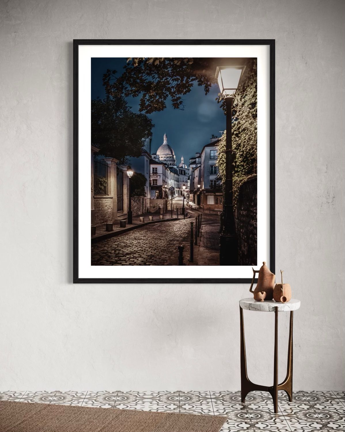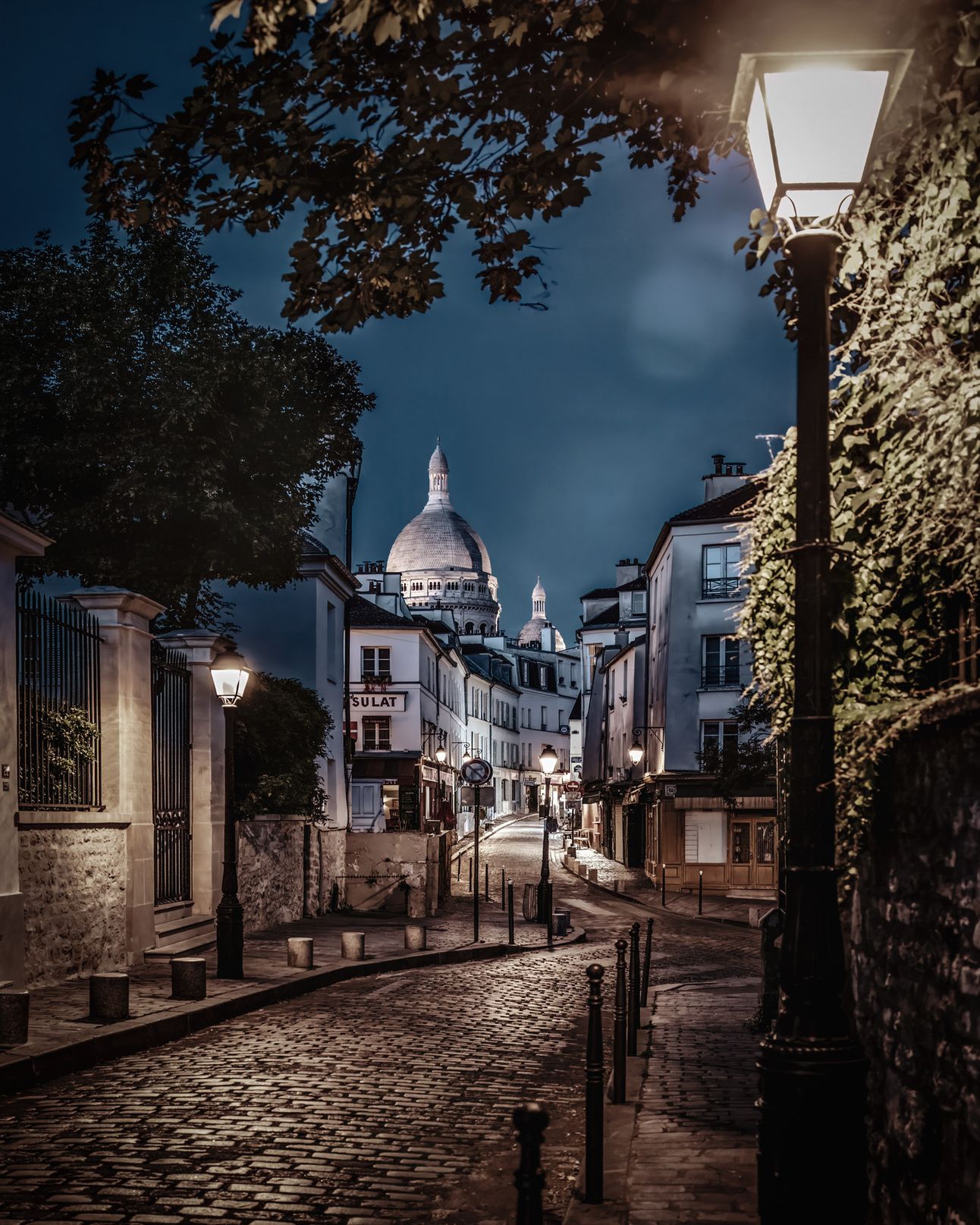 As twilight deepens, Montmartre awakens, bathed in the ethereal glow of the blue hour. Illuminated lamp posts stand as silent sentinels, guiding the way through the meandering streets, each light a beacon against the encroaching night. In the distance, the Sacré-Cœur perches regally, casting its venerable silhouette against the cerulean sky. It's in moments like these that the spirit of Montmartre feels most alive, each cobblestone and corner echoing tales of artists, lovers, and dreamers who once tread the same path. This image is a visual treat and a soulful ode to Paris's enduring romance.