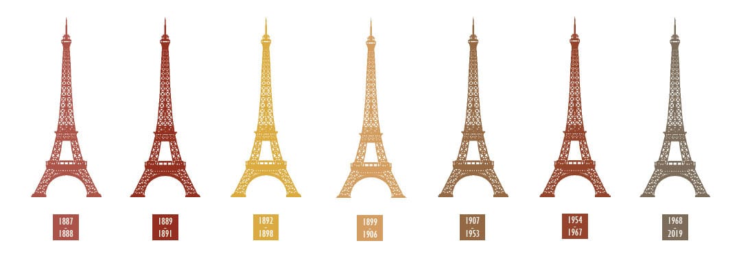 Throughout its life, it has worn Venetian red and yellow-brown before today’s Eiffel Tower Brown. The paint is applied in a gradient, darker at the base and lighter at the top, to sharpen the silhouette. In the summer heat, the iron expands, and the tower can grow by approximately 15 centimeters.